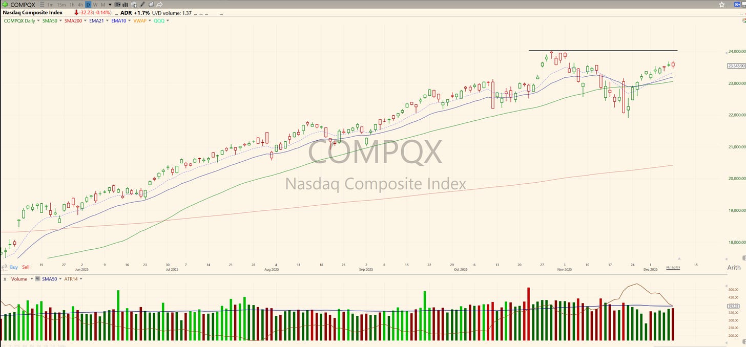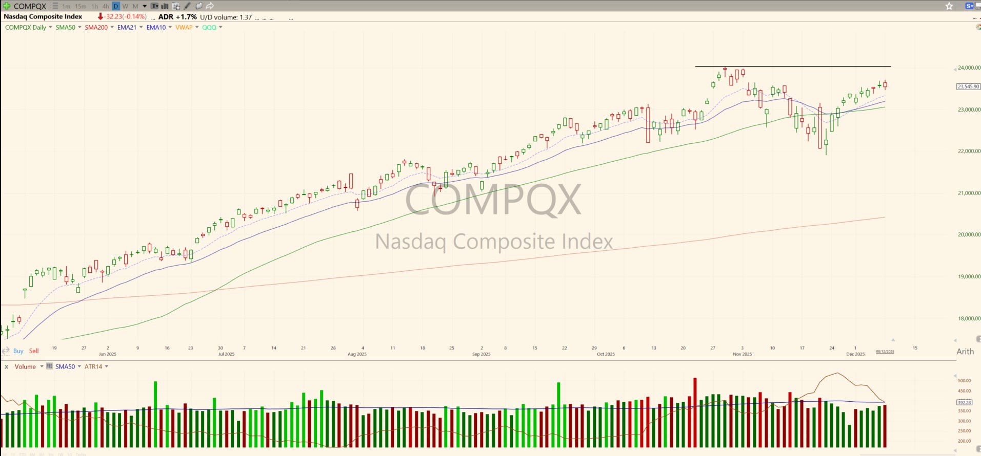 The chart of the Nasdaq Composite shows price knocking again on the same horizontal resistance from November, but the index closed under it. Until buyers decide to push through, the market remains in a holding pattern.