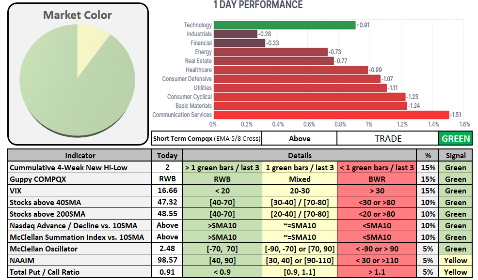 Red: Tech and Communication Services, weighed down by the media consolidation headlines and the Mag 7 softening.
